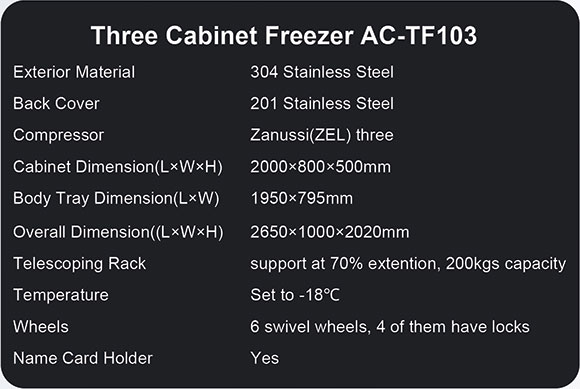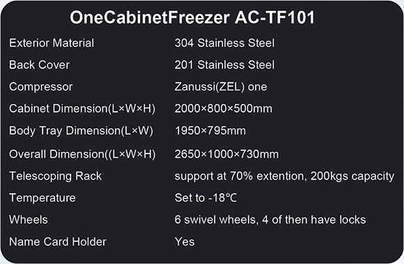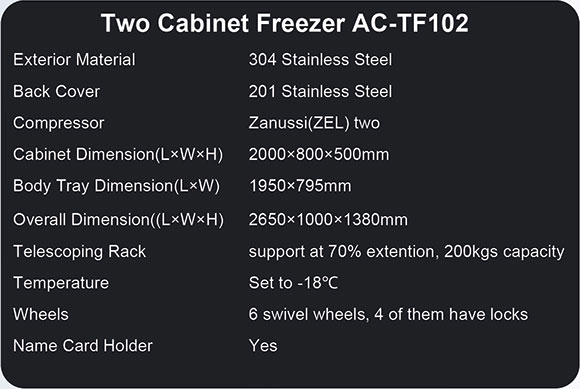 Telescoping Rack Mortuaryfreezers made by AC in the funeral equipment sector are specifically tailored for the storage of human remains. Featuring a telescoping rack that supports up to 70% extension, it allows for easy access and efficient organization of remains, enhancing functionality in high-demand environments.